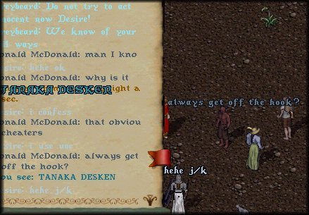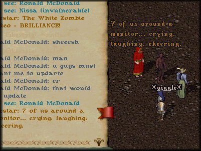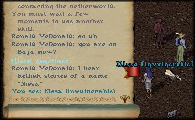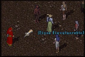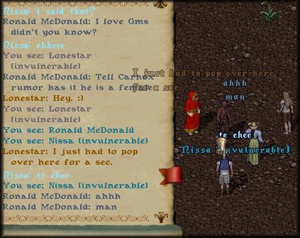 Well the evening was certainly a wierd one,and I must say it qualified as one of the better wierds I have experienced. I was in the middle of making the little WTFman intro, making the frames for the 3 gm's I planned on killing, and I had a Spirit Speak macro running full blast in Vesper on my new newbie Ron, whilst I went about my business in Paintshop. I just happened to check the screen to make sure my connection was still fine, when I notice that I am bouncing around the screen like a rabbit on quadruple expresso. I didn't spy anything wierd, but when I tapped everyone's favorite allnames macro and popped open the ol' journal and scrolled up a bit, I noticed a "Nissa" had repeatedly been screaming "I WANT A HAPPY MEAL," and sure enough after allnames had cleared I see the form of a humanized invulnerable Nissa GM running around me in circles and picking me up and dropping me whever she so chose. I seemed tor ecall the name Nissa, I recollected various E-Mails regarding "a bitch red robe on Lake Superior," so I assumed I was being tested for everyone's other favorite last target macro. So I respond with the usual "wtf man" for good measure. I begin to engage Nissa in conversation when out of nowhere pops another Favorite, GM Ghostpig. (See Screenshots section - He was the one who killed me in jail with a guard for his version of good measure). This was certainly interesting. I missed a good bit of conversation while stumbling to load Hypersnap - for pictures of course, GM watching is an all time favorite of mine.