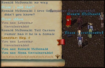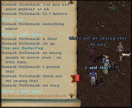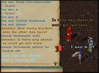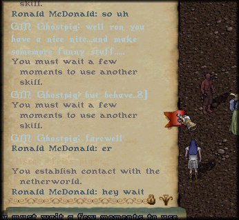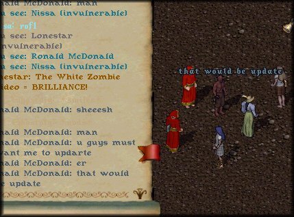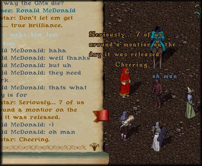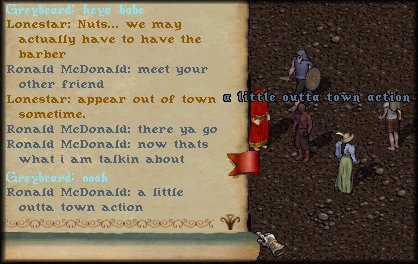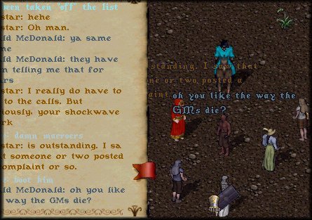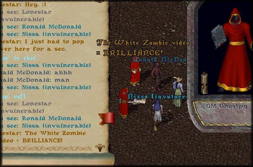 Well the evening was certainly a wierd one,and I must say it qualified as one of the better wierds I have experienced. I was in the middle of making the little WTFman intro, making the frames for the 3 gm's I planned on killing, and I had a Spirit Speak macro running full blast in Vesper on my new newbie Ron, whilst I went about my business in Paintshop. I just happened to check the screen to make sure my connection was still fine, when I notice that I am bouncing around the screen like a rabbit on quadruple expresso. I didn't spy anything wierd, but when I tapped everyone's favorite allnames macro and popped open the ol' journal and scrolled up a bit, I noticed a "Nissa" had repeatedly been screaming "I WANT A HAPPY MEAL," and sure enough after allnames had cleared I see the form of a humanized invulnerable Nissa GM running around me in circles and picking me up and dropping me whever she so chose. I seemed tor ecall the name Nissa, I recollected various E-Mails regarding "a bitch red robe on Lake Superior," so I assumed I was being tested for everyone's other favorite last target macro. So I respond with the usual "wtf man" for good measure. I begin to engage Nissa in conversation when out of nowhere pops another Favorite, GM Ghostpig. (See Screenshots section - He was the one who killed me in jail with a guard for his version of good measure). This was certainly interesting. I missed a good bit of conversation while stumbling to load Hypersnap - for pictures of course, GM watching is an all time favorite of mine.