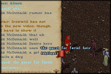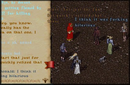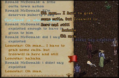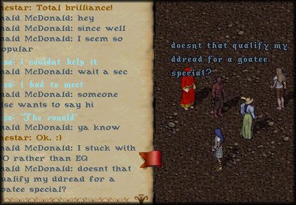Having recently remembered the post on Dr. Twister's news page about Lonestar and his "Horseraces" he held in order to test for UOE on whatever shard that was, I of course told him it was brilliant. If it was a true story, it was damned funny. That's how I knew he had skills. An ingenius GM idea. Did such a thing really exist, or was it just another fairy tale? Well, naturally, it appeared Lonestar denied the motive of checking for UOE, and said what was said on Twister's site was false, and that he had read that bit too. What he said was that he started it as a Fun RP Event, but then afterwards realized that people would probably say what he read on Twister's page. Looked like a classic GM coverup. Regardless, I still think that horserace idea was terrific if I do say so myself.