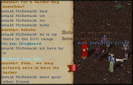 Nissa left Lone and I alone - I quickly called Greybeard for backup. As Grey arrived, going back to wierd events regarding facial curlies, Lonestar spoke of GM Barders who travel throughout the cities to fulfil those desires of the townfolk who are low on pubescent hormones. This was getting ineresting. A barber. Ron can't get to town. He asked details, and Grey brought the beer. Oh what a night.