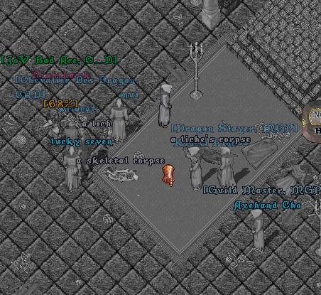 Valid and I were both red in the lich room on Covetous lvl 3 (not perma, just red) and we invited all 7 of the people there for a them vs us. Thank god, Valid had the presence of mind to take a pic. Granted he was dead, but that was from a fluke lich ebolt that was rather unexpected. This is obviously a picture of all of the ghosts (except one because obviously the one without the allnames name over the head is Valid). There are two people and a lich left - Nighthawk against wildcat and the lich.