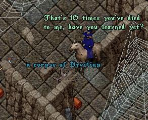 ![]() I'd killed him so many different ways and with three different characters, that when i told him that I'd killed him 11 times, he challenged me to a duel since he thought he could take me 1on1. Even with a store bought regular bow, this is was happened. I even went murderer for his sorry ass. Oh well, that's 12 and counting... |