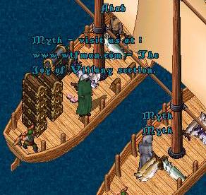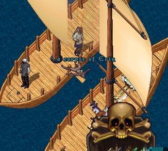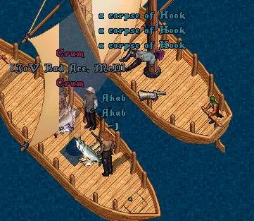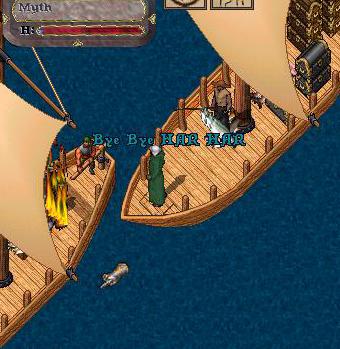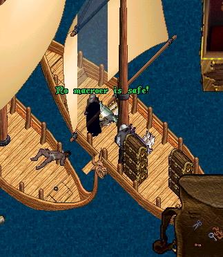 We quickly discover that people like to macro on their boats in the middle of the ocean. We also found out that you have to macro with a key on you or you end up back on shore if you lose connection. I'm not the type of guy who gets off on killing macroers, but since macro fishermen have tons of loot, a free boat, rares, SOSs, etc - obviously, that means we're going to end up killing someone. NH couldn't take another murder, so the two fishermen had to do the dirty work. Erin was our first victim and our strangest encounter. I guess it was strange because we hadn't ever looted a boat before. We got on her ship my looting the key off her body and letting ourselves on. As you can tell by the picture, the boat was empty except for what was on her body and what was in the hold. Well, in the hold was about 20 more SOS bottles and some rares. They're worth about 2k each in gold, magic weapons, regs, scrolls and most importantly - rare items.